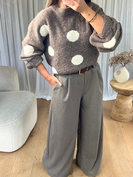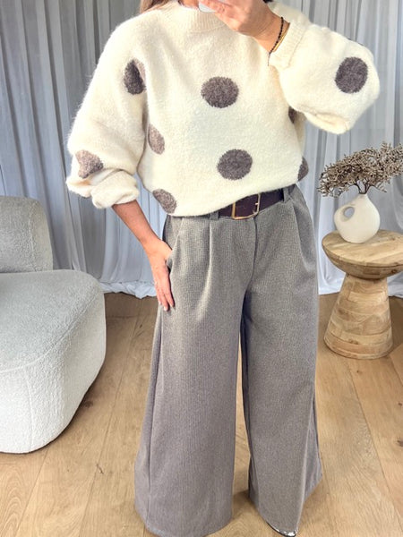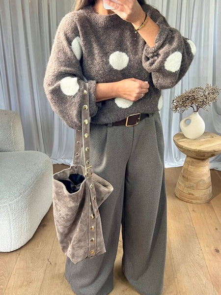 - Détail look 1 : Le pull Pois taupe et le sac Besace clous