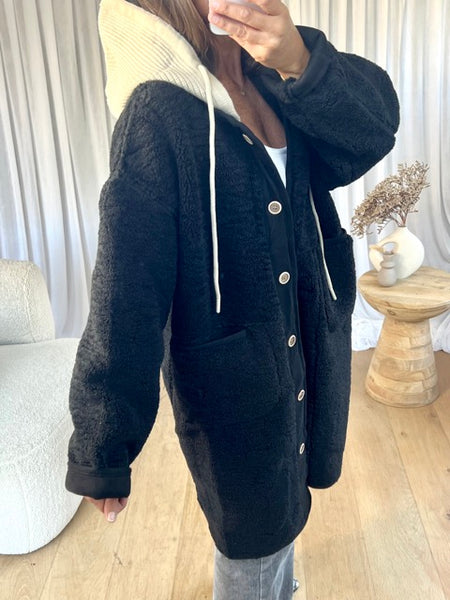 • Manteau moumoute avec capuche amovible, boutons détachables tout le long, 2 poches sur le devant, qualité ++, doublure toute douce suédine