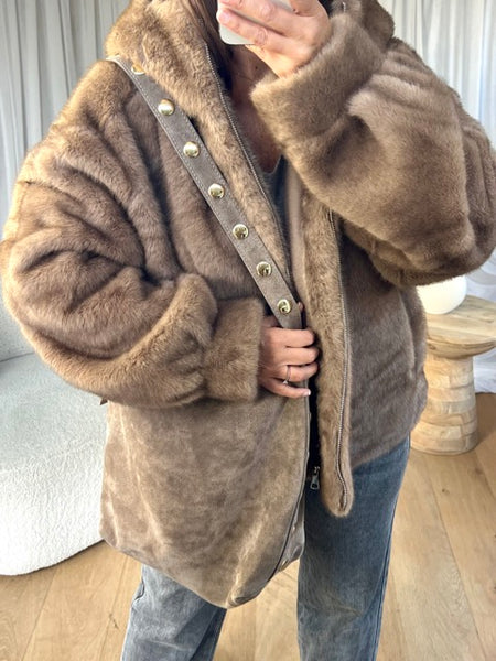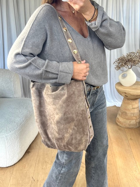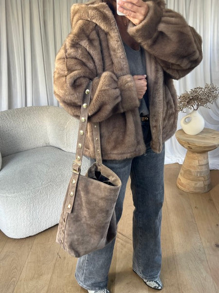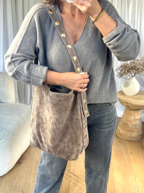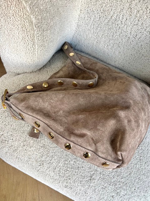 - Sac en cuir de daim, hanse réglable à clous, fermeture éclair