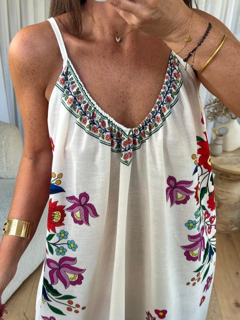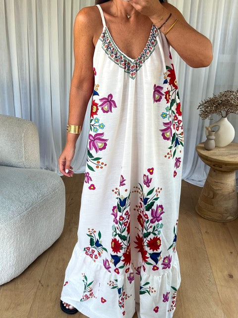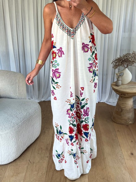 - Robe longue à fines bretelles réglables, col V, volant sur le bas