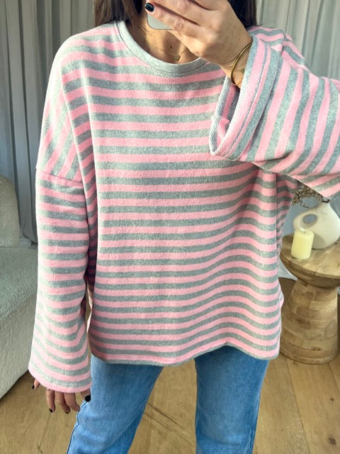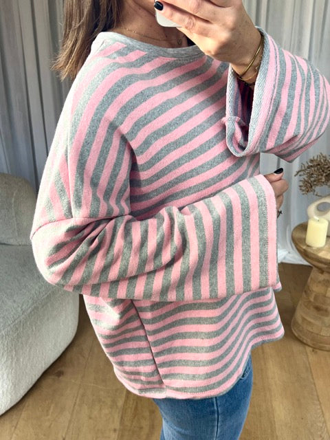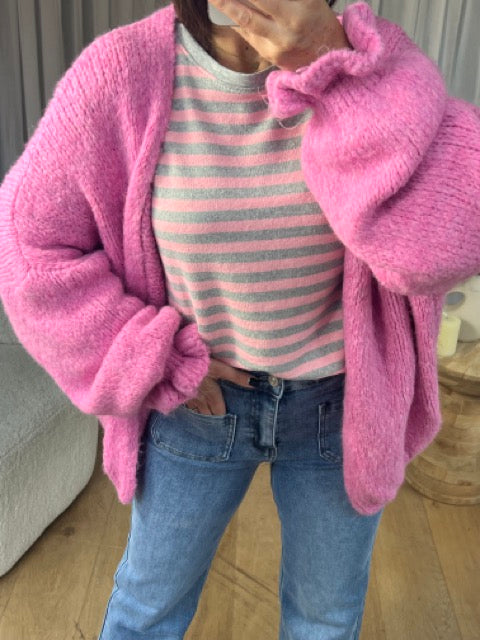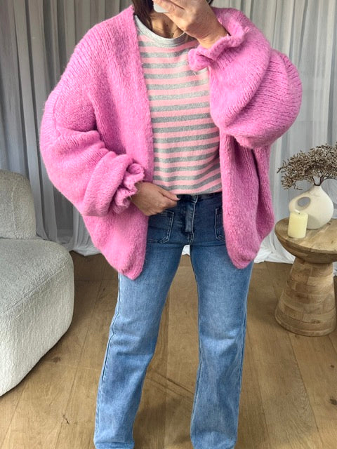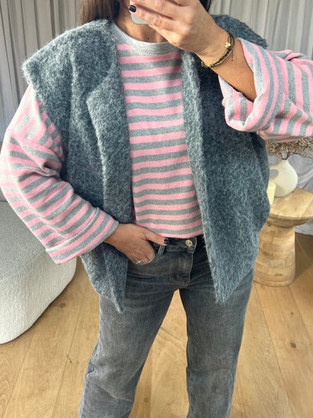 - Détail look 1 : Le jeans Boris bleu et le gilet cosy Froufrou rose