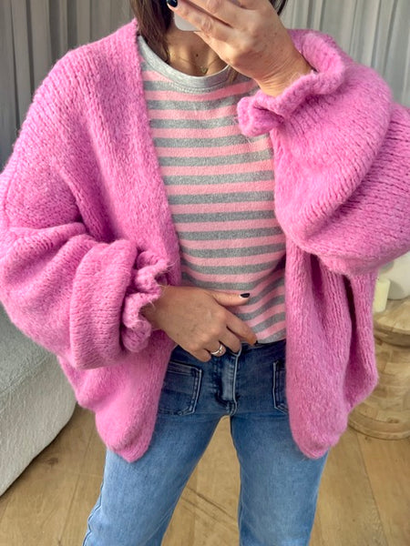- Détail look 1 : Le top Rayé rose et gris et le jeans Boris bleu