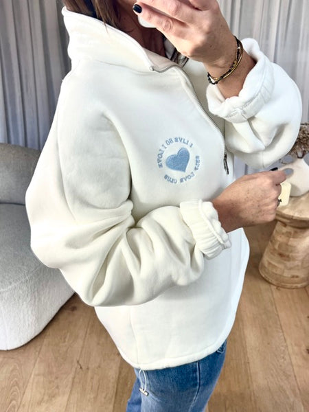 - Sweat col zippée, manches longues, élastuqe réglable sur le bas, doublure toute douce