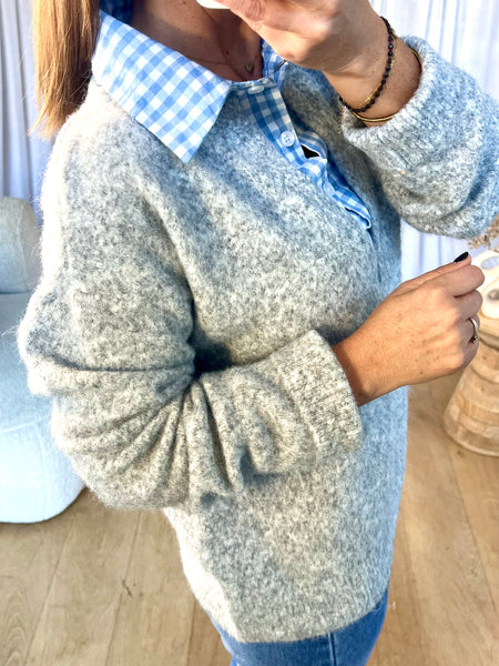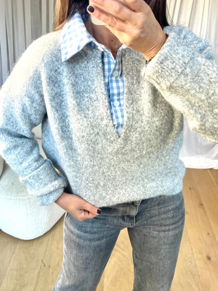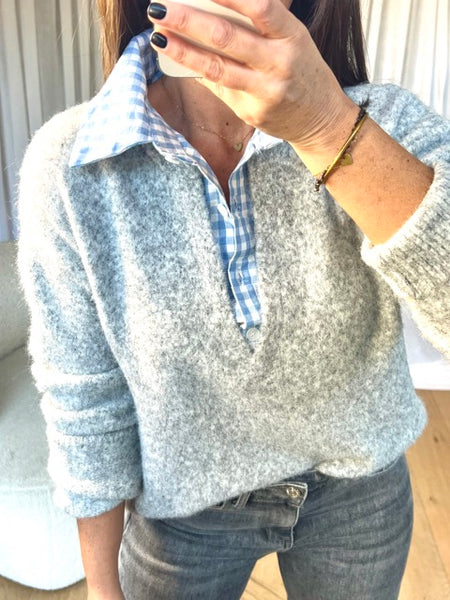 PULL COL CHEMISE VICHY GRIS