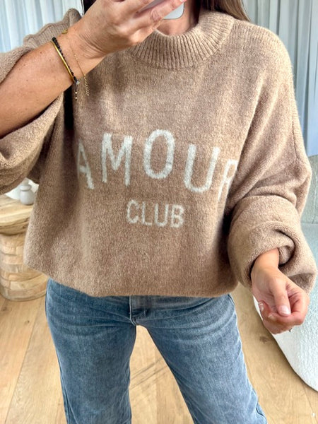 - Pull manches longues, col rond légèrement montant, Motif : "AMOUR CLUB"
