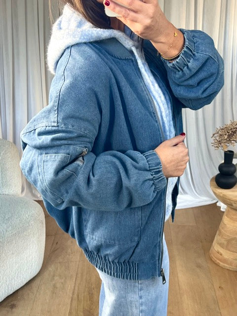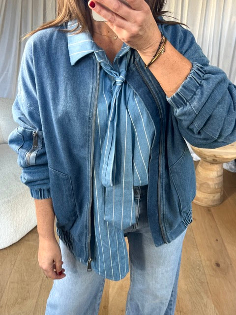 - Bombers denim, fermeture éclaire, élastique sur le bas et le bout des manches, 2 poches sur les côtés et une petite zipée sur le bras