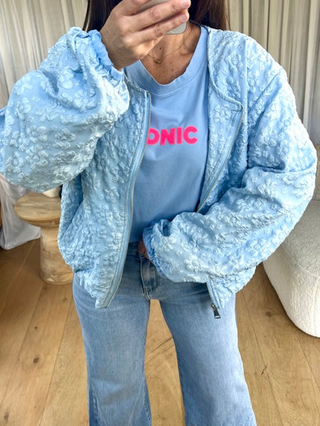 - Détail look 1 : Le jeans Cool bleu et le bombers fleur bleu